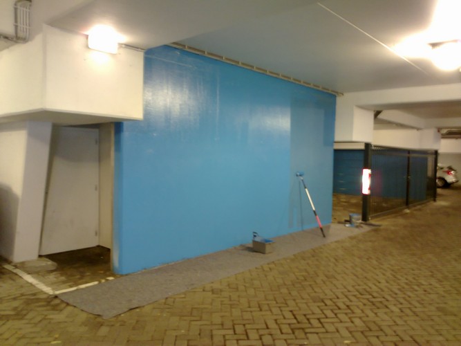Werkzaamheden: Muur na graffiti vandalisme opnieuw geschilderd met gebruik van Sikkens latex. |