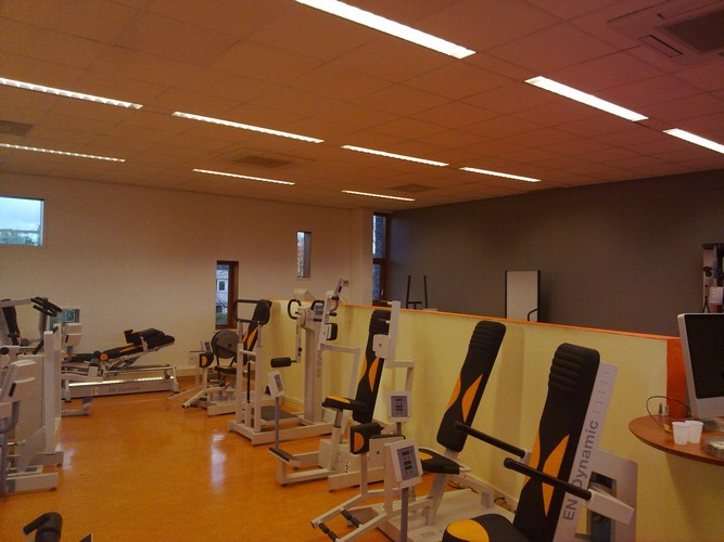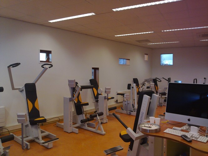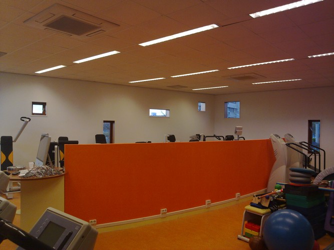 Dit is een foto van de sportzaal die een ander kleurtje heeft gekregen met gebruik van Sikkens lak. |