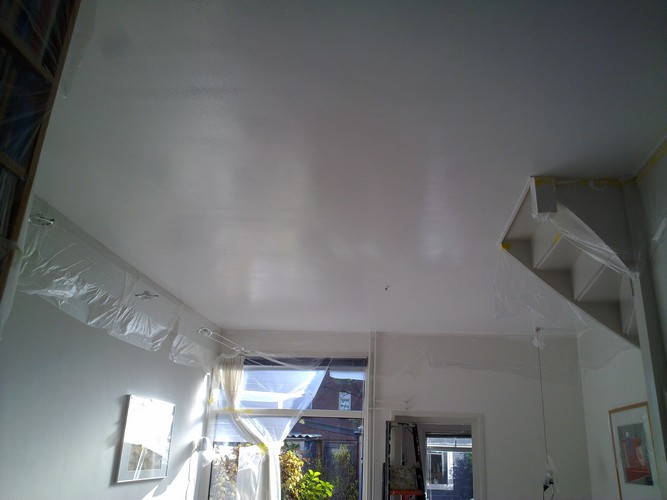 Werkzaamheden: In opdracht van verzekering na waterschade plafond opnieuw behandeld met gebruik van Veveo Latex. |
